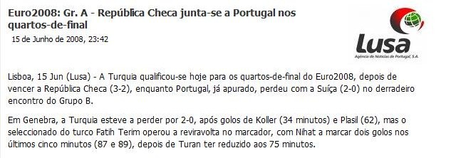 E já agora este texto aqui: “Portugal e Turquia conhecem os adversários de quinta-feira nos quartos-de-final, que serão encontrados entre o trio formado por Alemanha, Polónia e Áustria.”