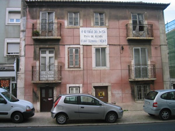 É com graça que reparo nas cortinas velhas em janelas abertas. Num vaso que é regado regularmente (a planta verdeja, não é?). Num anúncio provocador de desacatos entre vizinhos (ou será que os vilões dos inquilinos do 1º e 2º andares, tanto à direita como à esquerda da foto, são os senhorios do gajo dos 1,6€?). Só não concordo com o Comentário-50: os caixilhos em alumínio não são bons e desvalorizam uma casa…
