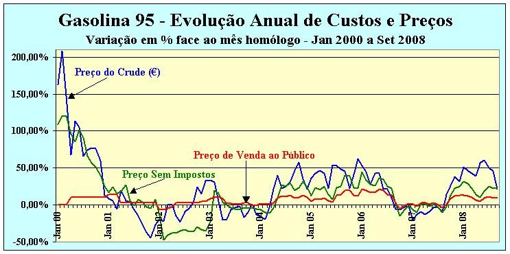 Trabalhando os dados – custos e preços médios mensais entre Janeiro de 1999 e Setembro de 2008 – determina-se facilmente o crescimento móvel em 12 meses de cada um dos componentes do preço da gasolina. O gráfico ao lado, mostra o crescimento percentual em cada mês face ao mês homólogo anterior do preço de venda ao público da gasolina (PVP) e de dois dos seus componentes, o custo do crude e o preço sem impostos (PSI). Por uma questão de melhor leitura do gráfico, não se incluiu a evolução do ISP e do IVA, os outros dois componentes do preço final.