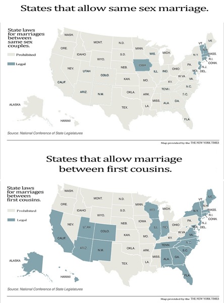 Com base nos mapas, em que Estados americanos é que o casamento entre primos do mesmo sexo é permitido.