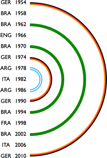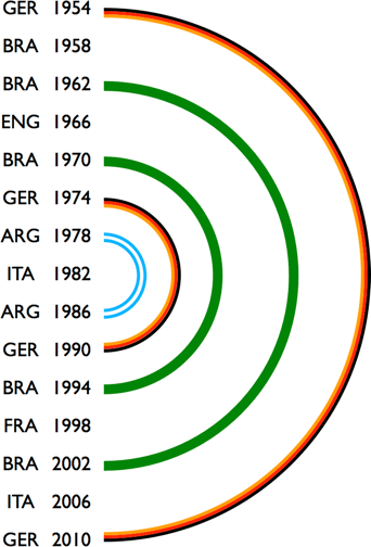 3964- 2010= 1954 e ir ver quem foi campeão nesse ano. Idem para os outros anos