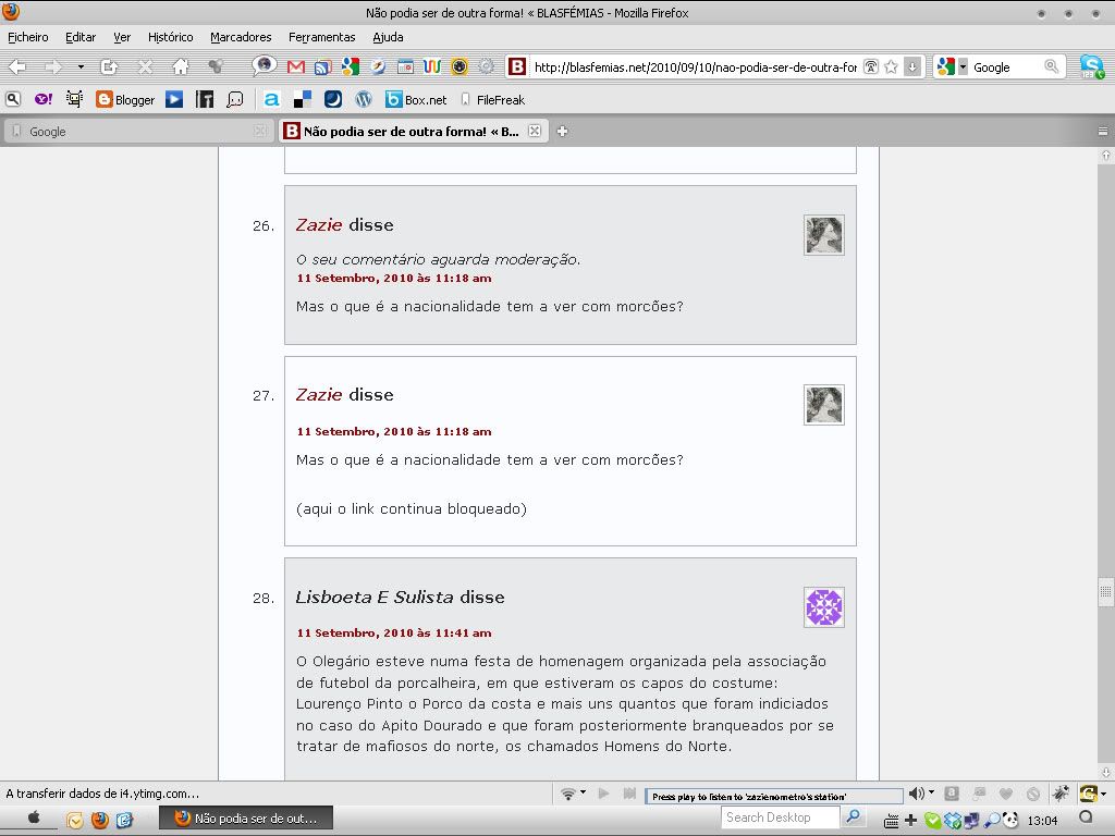 Este tom psicótico anti-português e anti-Portugal de ambos é tipico. E há mesmo um Pseudo-Galaico que anda pelos blogs Blasfémias(Bússula etc.) mesmo xenófobo também e pseudo-racialista(não sei como é que o Porto vai jogar sem estrangeiros ou pessoas de outra cor) a fazer-se passar por “benfiquista” pseudo-lisboeta “sulista” – e portista fanático ao mesmo tempo, falando de independências a norte do Douro(ou próximo) e a utilizar a mesma linguagem nas duas personalidades opostas. (Que miséria e que psicose, fosga-se! Terapeuta já!). Como não conseguem Nortenhos para a sua causa (claro eheheh), desesperam-se em multi-nicks, multi-contas e paranóias na net ainda tentando tudo contra Portugal – Já não visito blogs com comentários de baixo nível.