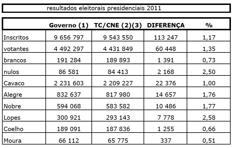 O quadro seguinte compara os resultados divulgados pelo Governo (1), através do site presidenciais 2011 (da responsabilidade da DGAI), com os resultados oficiais apurados pelo Tribunal Constitucional (2) e pela Comissão Nacional de Eleições (3). Uma diferença superior a 100.000 eleitores e a 60.000 votos, desaparecidos entre o dia das eleições e a divulgação dos resultados oficiais, é absolutamente injustificável. No entanto, gostaria de ouvir algumas explicações.