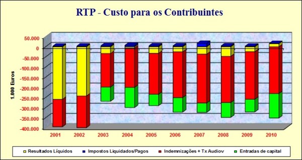 O esforço dos contribuintes, depois de um alívio em 2003 na sequência da reestruturação de Almerindo Marques, não tem deixado de se degradar. Em valores tais (média anual de 324 milhões), que fazem da RTP o maior sorvedouro de entre as empresas públicas, incluindo as eternamente deficitárias empresas de transporte.
