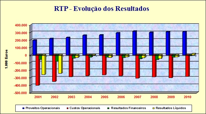 A exploração da RTP até tem evoluído no bom sentido: proveitos com tendência crescente (muito embora 75% destes sejam representados por fundos públicos) e custos decrescentes. Os resultados têm melhorado assinalavelmente, de tal forma que, em 2010 já foram positivos (coisa inédita em várias décadas) em cerca de 15 milhões de euros. No entanto…