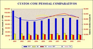 Apesar de terem um volume de actividade basicamente semelhante, a RTP tem um quadro de pessoal e respectivos encargos entre 3 a 4 vezes superior ao dos seus concorrentes. Refira-se porém que os números subjacentes ao gráfico não são directamente comparáveis, dado que os da RTP são consolidados, integrando toda a estrutura da RDP. Isto porque, ao contrário da Impresa e da Média Capital, a RTP não apresenta nos seus Relatórios e Contas anuais a repartição por áreas de negócio. Pode-se porém estimar com alguma segurança que o quadro de pessoal da RDP não será superior a 30% do valor consolidado, o que fará com que o segmento Televisão da RTP utilize bem mais do dobro dos recursos dos seus concorrentes.
