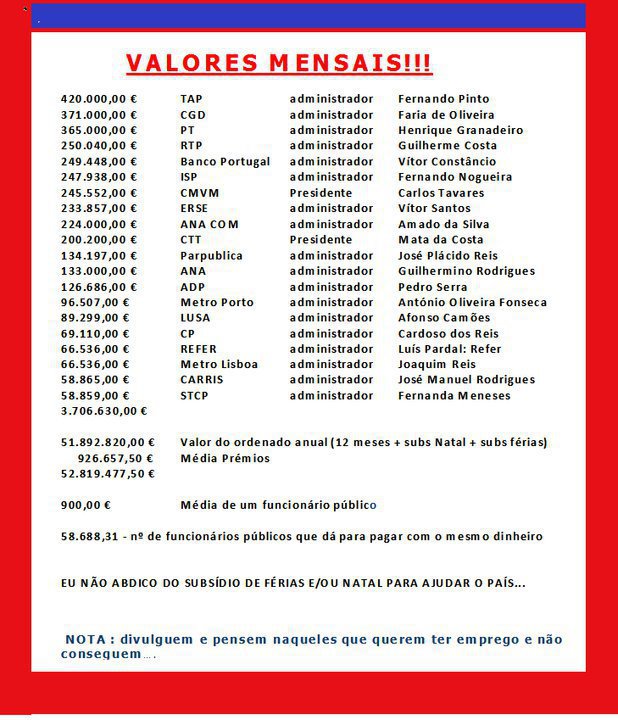 Replicará você de forma tipicamente “pavloviana”: “Ah, mas os “tachistas” na função pública não se limitam àqueles, são muitos mais!”. Ok, multiplique o valor por 10 e já poderemos abranger a generalidade dos gestores de empresas públicas, municipais e institutos públicos, mas você terá de me comprovar que existem em Portugal entre 1.500 a 2.000 gestores públicos com um salário médio mensal de € 13.238, o valor implícito no panfleto que eu contesto na posta. Multiplique tb por 10 as repartições acima calculadas por fp e diga-me se isso é suficiente para compensar a retirada dos subsídios de férias e de Natal, como se insinua desonestamente no dito panfleto.