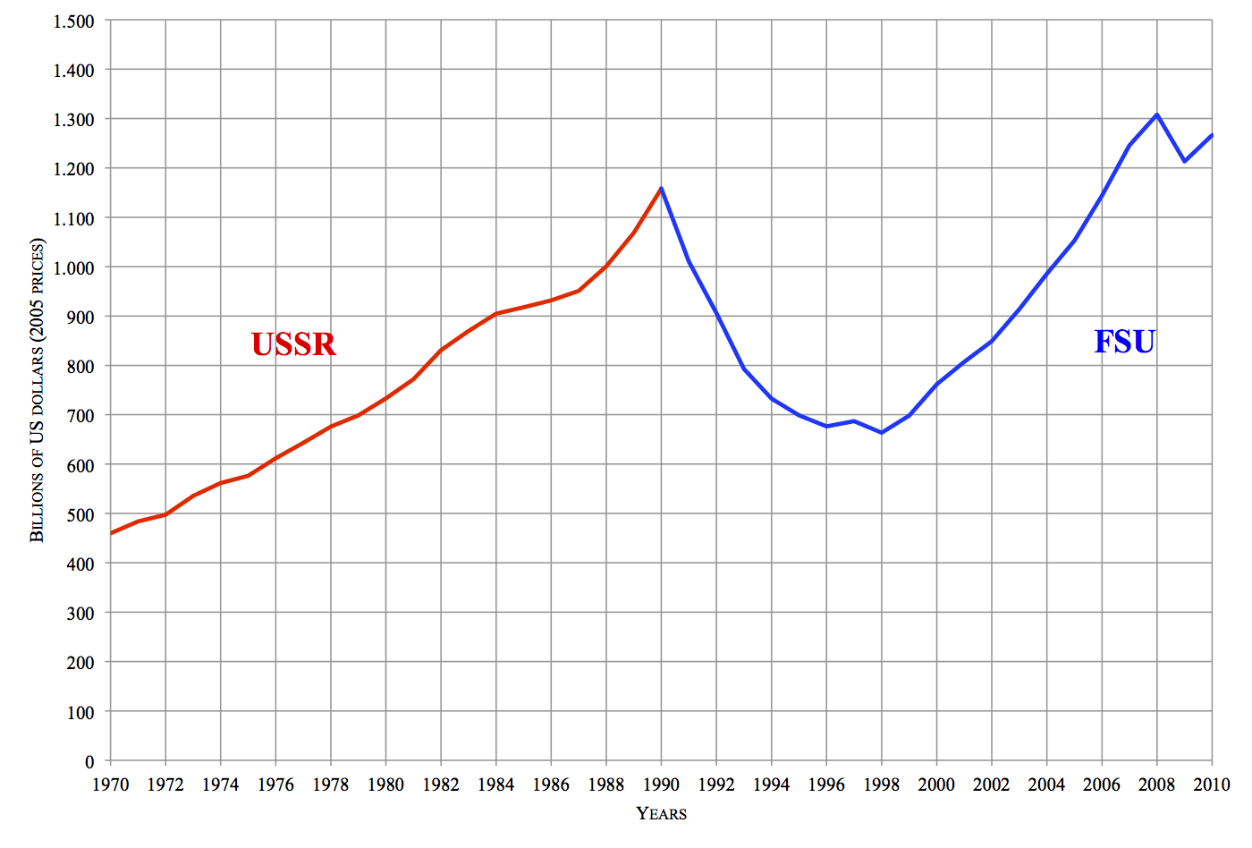 Antes de se porem a elogiar a maginifica curva ascendente soviética, convém recordar que o colapso da economia da URSS deveu-se a políticas económicas destrutivas que vieram acompanhadas de fraude massivo nas contas, a fim de iludirem os contabilistas fervorosos a acreditar que essa treta do comunismo realmente funcionava. Mas no entanto, tal como aconteceu na grécia, há sempre uma altura onde não dá para passar a batata quente, e a realidade teima em sobrepor-se a esses artificios. Ou será que acreditam mesmo um colapso desastroso da economia, como aquele que aconteceu na URSS, acontece de um dia para o outro apesar de uma economia supostamente pujante?