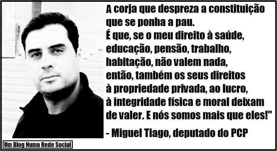 Não é Miguel Tiago que fala da “integridade física”, é a Constituição. Miguel Tiago somente diz que ao desprezarem a Constituição que consagra os direitos sociais que ele enunciou, estão também a desprezar a Constituição que lhes consagra o direito à integridade física e à propriedade privada.