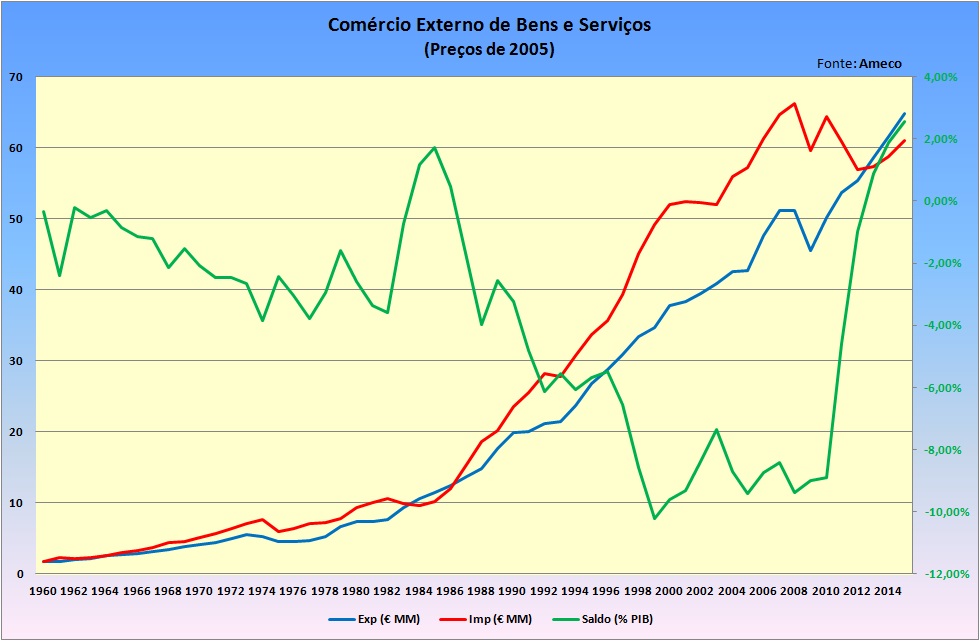 Ainda é cedo para se tirarem conclusões quanto a alterações significativas quanto aos patamares de especialização da nossa economia. Há alguns dados positivos, como o upgrade na cadeia de valor que os sectores do calçado e da têxtil já conseguiram, a queda do défice na fileira alimentar, bem visível no aumento das exportações de produtos agrícolas e bens alimentares, ou o surto nas exportações de combustíveis refinados, só possível porque se fizeram investimentos ao nível da refinação que garantiram capacidade e competitividade internacional. Mas subsiste a preocupação quanto ao crescimento das exportações que, embora sendo dos mais elevados na zona do Euro, ainda é insuficiente. Embora elas tenham acelerado desde 2009, a tendência de crescimento de longo prazo mantém-se basicamente a mesma desde 1988, como é bem visível no gráfico. Ou seja, o grosso do reequilíbro da balança comercial fica a dever-se à queda brusca das importações, a vítima (deliberada) das restrições implementadas à “sacrossanta” procura interna.