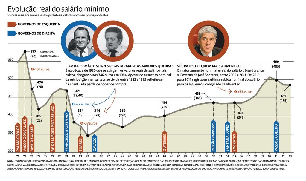Como mostra este gráfico do próprio Expresso, o salário mínimo ao longo dos últimos 39 anos foi sempre menor que o do PREC.