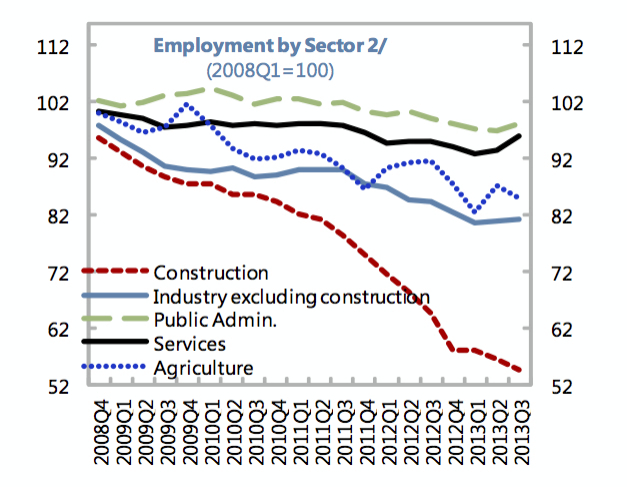 Sem surpresa (ver o que escrevi aqui) o sector mais afectado foi o da construção, onde desapareceram quase metade dos empregos. A dimensão dos números do desemprego, que suspreenderam os economistas, pode ter aqui uma explicação, pois este sector é muito mão-de-obra intensivo. A seguir, na perda de emprego, vem a indústria e depois, com uma perda de emprego na casa dos 15%, aparece-nos a agricultura (eis outro mito que desaparece: afinal parece que não é nos campos que os desempregados das cidades estarão a reencontrar trabalho). O sector dos serviços aguentou-se menos mal, mas mesmo assim fica atrás da Administração Pública, o sector que melhor se comportou no que respeita à conservação do emprego.