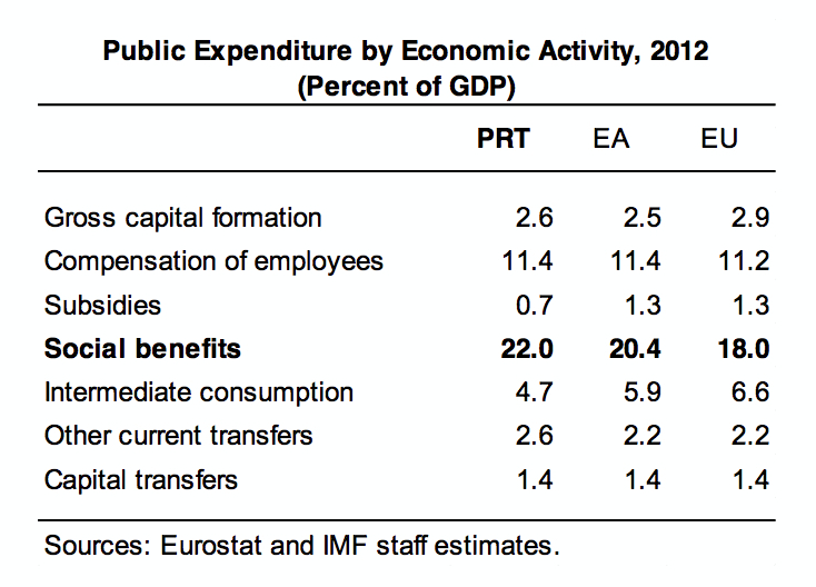 Em 2012 Portugal gastava 22% do PIB com o chamado “estado social”. Isso compara com os 20,4% de média da Zona Euro e com os 18% da União Europeia como um todo. Não está mal como resultado depois do “maior retrocesso social de sempre”, ou do famoso “recuo civilizacional”, ou de tantas outras barbaridades que por aí se proclamaram.