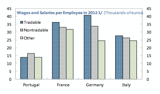 Tomemos este primeiro gráfico. Alguns só verão nele a diferença salarial existente entre Portugal e países como a França, a Alemanha e a Itália. Eu vejo outra coisa: enquanto nesses países é no sector exportador que se pagam os melhores salários, em Portugal são os trabalhadores do sector não transaccionável os que, comparativamente, são melhor pagos. Isto mostra até que ponto este sector esteve protegido da competição – e até que ponto nele pesam os trabalhadores do sector público.