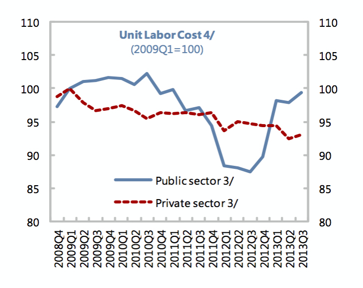 Comparando agora o que se passou desde 2008 no sector público e no sector privado também se chegam a conclusões interessantes. No sector público se compararmos o momento inicial e o momento final, ficámos praticamente onde estávamos: os custos unitários começaram por subir em 2009 (o famoso ano de eleições), depois cairam para valores próximos dos de 2008 por efeito de um primeiro corte salarial (ainda com Sócrates), a seguir encontramos um fosso provocado pelo corte dos dois subsídios em 2012, regressando depois os custos unitários ao seu valor de 2008 por efeito das desicões do Tribunal Constitucional. Já quando olhamos para o sector privado verificamos que esses custos unitários têm vindo a cair, situando-se hoje cerca de 7% abaixo do valor que tinham no primeiro trimestre de 2009.