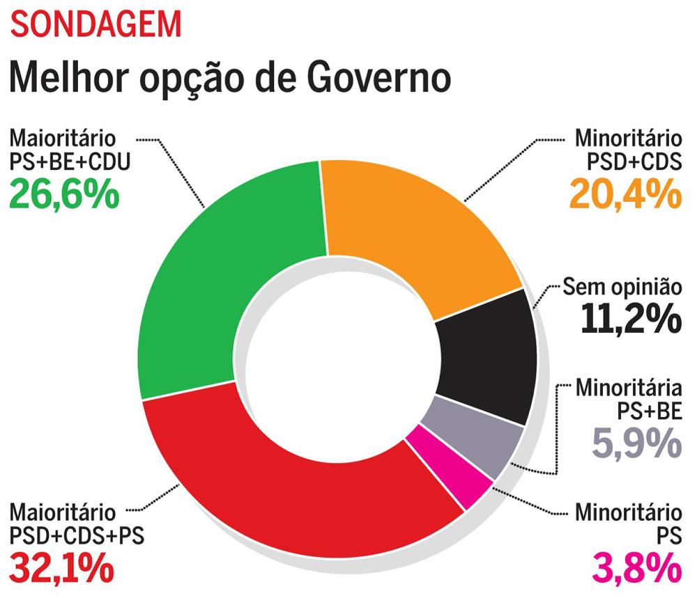 68,4% querem o PS num governo sozinhos ou num de 2 governos incompativeis : 32,1% num governo com a direita e Passos Coelho como PM ; 32,5% num governo do PS com o apoio dos partidos de esquerda ; 3,8% num governo do PS sozinho).