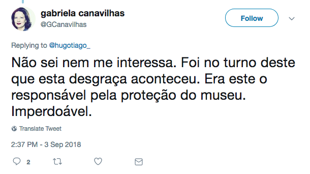De uma assentada esta apaga os 15 anos de desgoverno ladrão do PT. O museu faz anos que era admnistrado pela universidade do Rio de janeiro, tomada pelo PT e seus sucedâneos revolucionários neo-comunistas (ou socialistas do século XXI ) o PSOL que tem os seus braços armados no MST. A gabrielita “não sabe” nem quer saber porque acha que os outros “não sabem” que o Temer é a chapa da Dilmoca com quem ela se confunde.