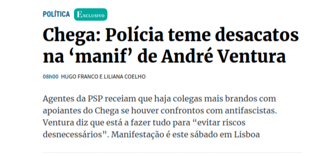 Se calhar o EXpresso devia ter começado por aí, pelo facto de saber que alguns grupos podem ir contestar a manifestação do Chega. Mas para o Expresso a notícia não é esse facto mas sim a possibilidade de a polícia ser mais branda com os manifestantes do Chega do que com os grupos auto-designados antifascistas mesmo que estejam a fazer aquilo que os fascistas faziam: marcar presença intimidatória e muitas vezes violenta nas manifestações convocadas por outros.