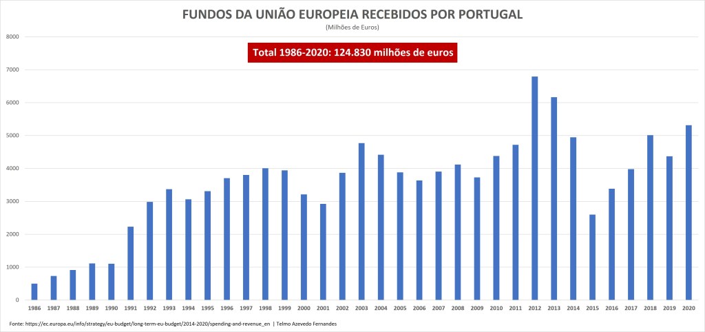 O que mais me surpreendeu no gráfico foi a enorme quantidade de dinheiro que veio da Europa nos anos de 2012 e 2013. Estes valores, comparados com os reduzidos valores do tempo dos governos de Cavaco Silva, quando esses subsídios se viam no terreno, deveriam permitir que Portugal convergisse com os países do centro da Europa, mas isso não aconteceu. Proposta minha: recusemos os fundos de falsa coesão e mobilizemos as poupanças dos portugueses para desenvolver os nossos sectores produtivos. Antes, todavia, estanquemos a despesas públicas que nos estão a asfixiar.