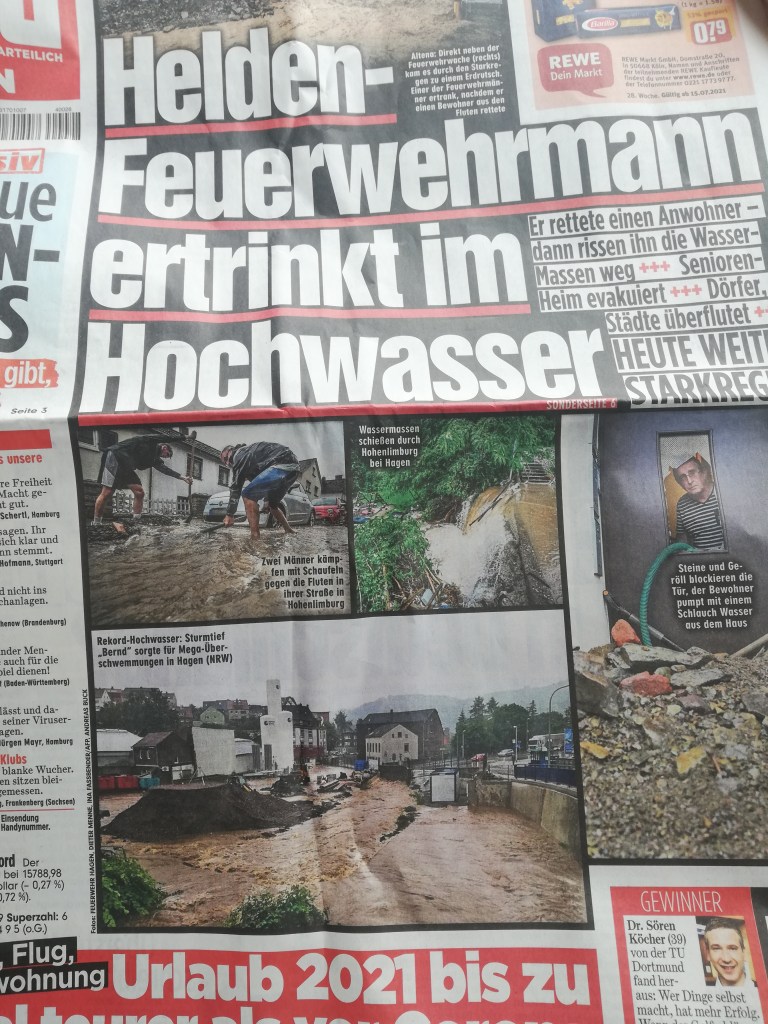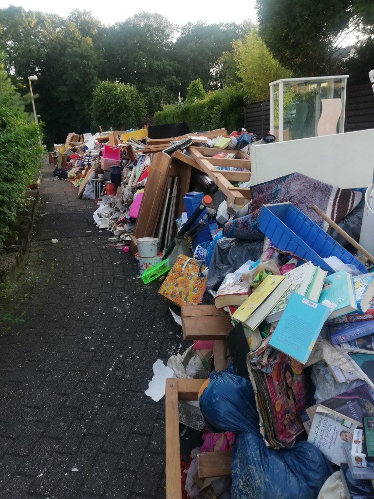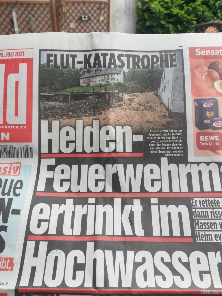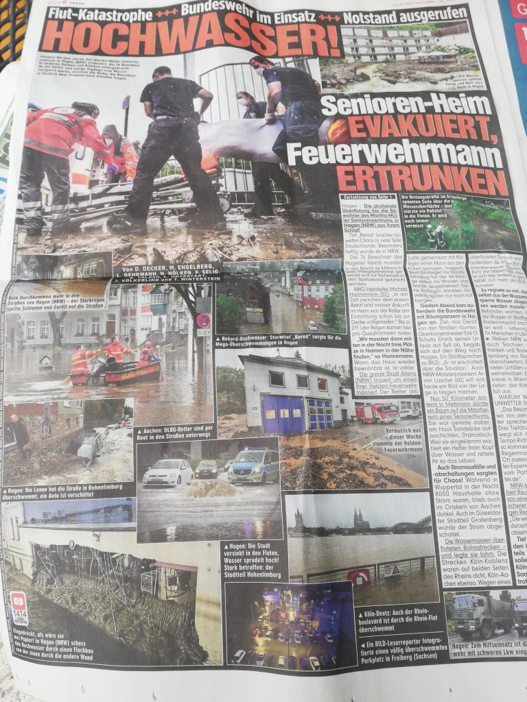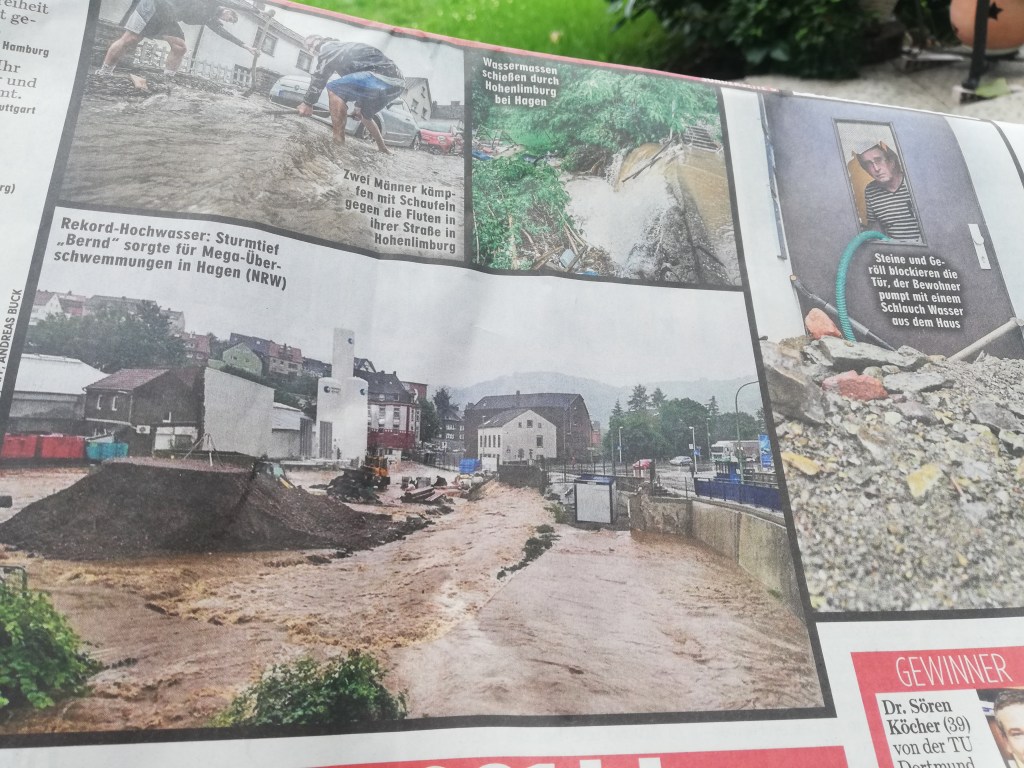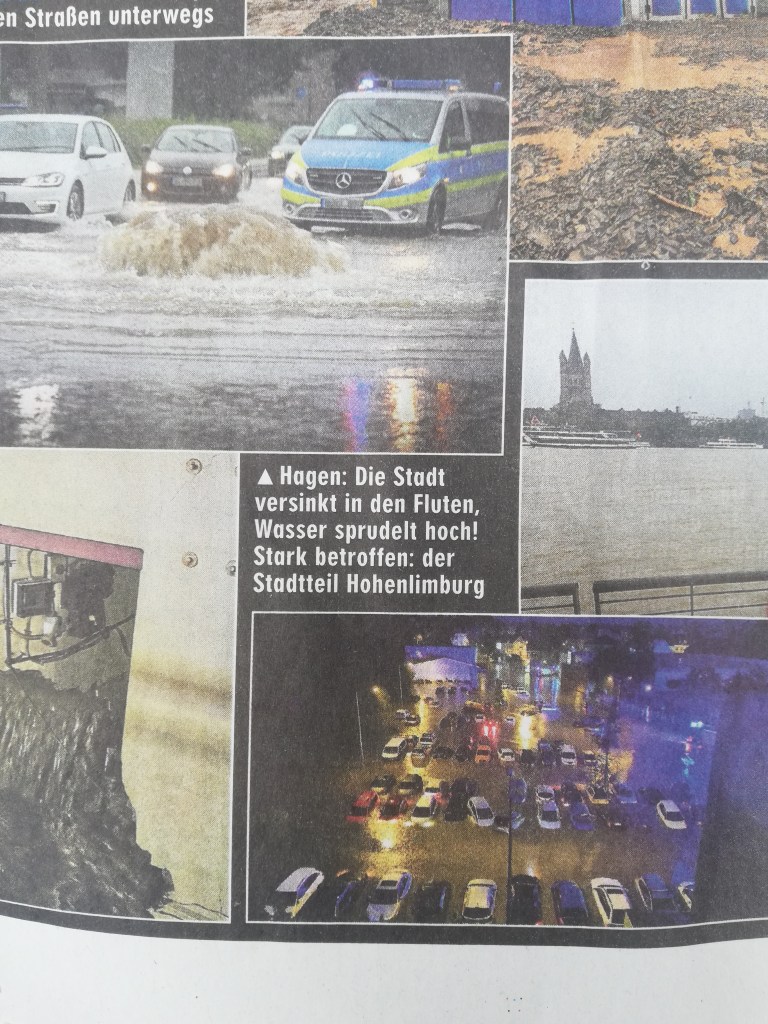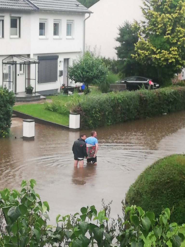 Na nossa localidade, Leverkusen, ainda não havia água na cave. Mesmo assim, a Proteção Civil já andava de porta em porta a alertar para o risco de cheias. Lembro-me de dizer ao meu marido, com surpresa genuína: “Nem é preciso estar tudo inundado para a Protecção Civil vir avisar as pessoas.”