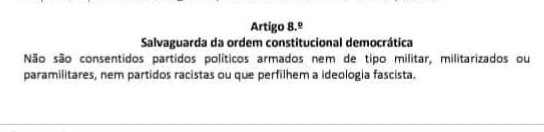 No artigo 46º – Liberdade de Associação diz assim: “não são consentidas associações nem armadas nem do tipo militar, militarizadas, ou paramilitares, nem organizações racistas ou que perfilhem ideologia fascista” e o artigo 8° da Lei dos Partidos o seguinte: